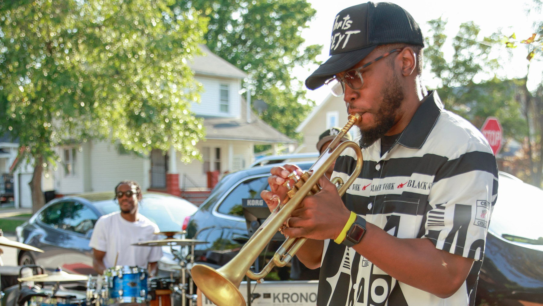 Grammy-nominated trumpeter Frank Walton leads the celebration outside Aaliyah's home.